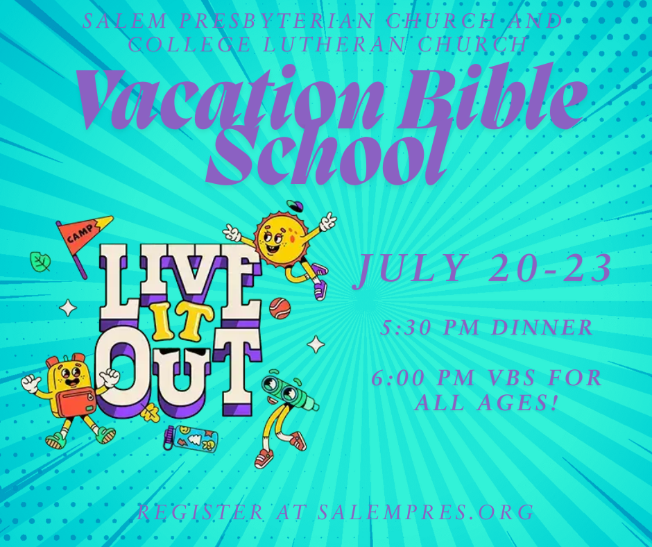 Join us as we learn how to LIVE IT OUT! There will be meals, Bible stories, games, crafts, and togetherness for all ages! There are classes for nursery, pre-kindergarten, and elementary children, and for youth and adults.